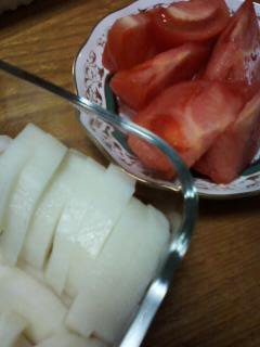 オバサンからトマトとお漬物を購入。